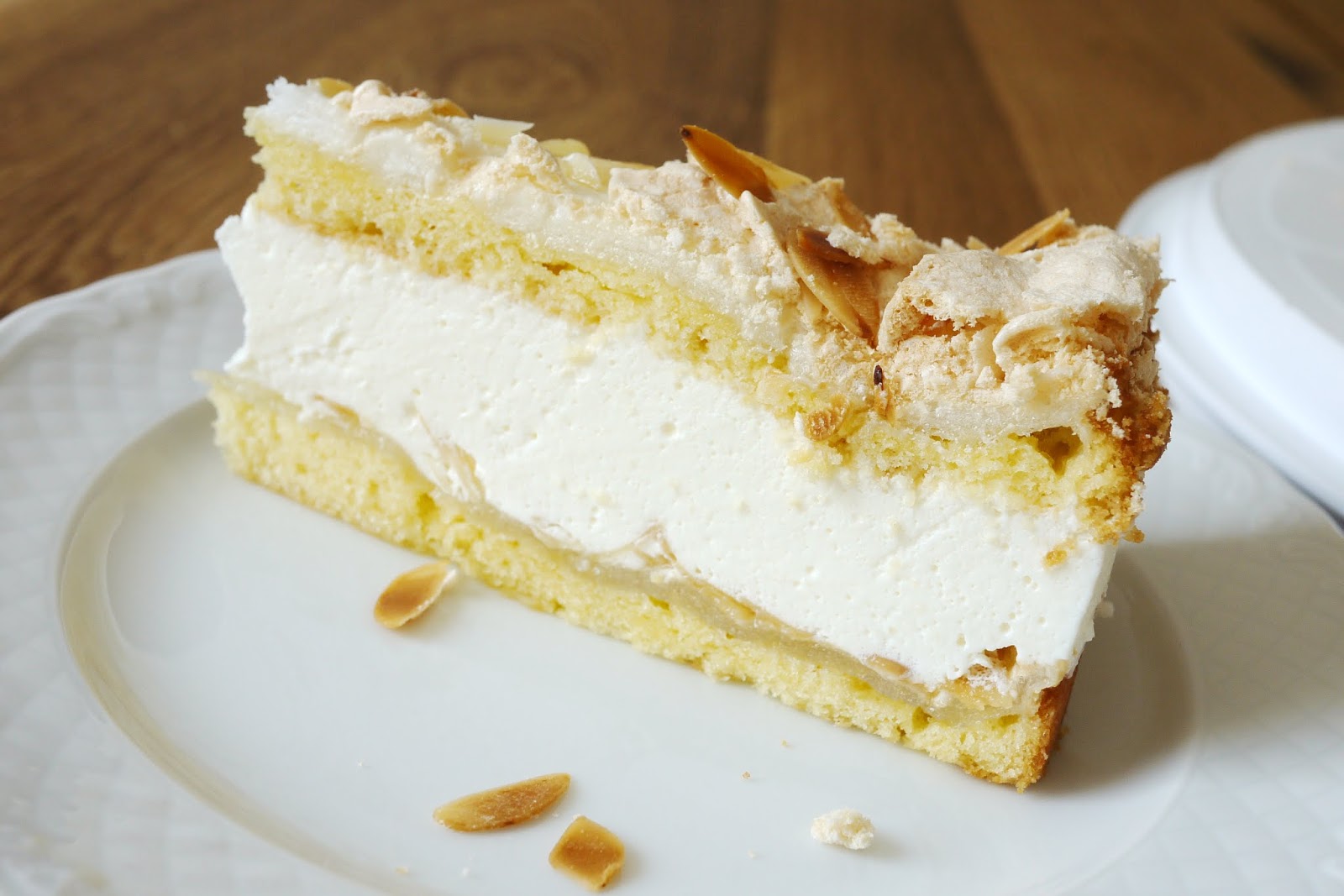 Rührteig herstellen, die Hälfte in eine runde, gefettete Backform (26 cm) streichen. Eiweiß steif schlagen und anschließend den Zucker unterrühren (Baisercreme). Die halbe Baisercreme auf den Rührteig streichen, dann die Hälfte der Mandelblätter darauf streuen. Bei 180°C Unter- und Oberhitze den Kuchen ca. 30 min. backen, dann abdecken und weitere 10 min. backen. Die zweite Hälfte ebenso backen. Für die Füllung Sahne mit dem Sahnesteif schlagen. Zucker, Schmand, Vanillezucker und Limettensaft in einer extra Schüssel verrühren und zuletzt die aufgelöste Gelatine dazu geben. Alles kurz kalt stellen und dann die Sahne unterheben. Dann einen Tortenring um den unteren Boden legen, die Füllung darauf streichen, dann den zweiten Tortenboden darauf legen und alles kalt stellen. Vor dem Servieren mit Puderzucker bestreuen. Diese Torte schmeckt aufgrund der Kombination süßer Boden - saftigem Baiser und der säuerlichen Creme einfach himmlisch.