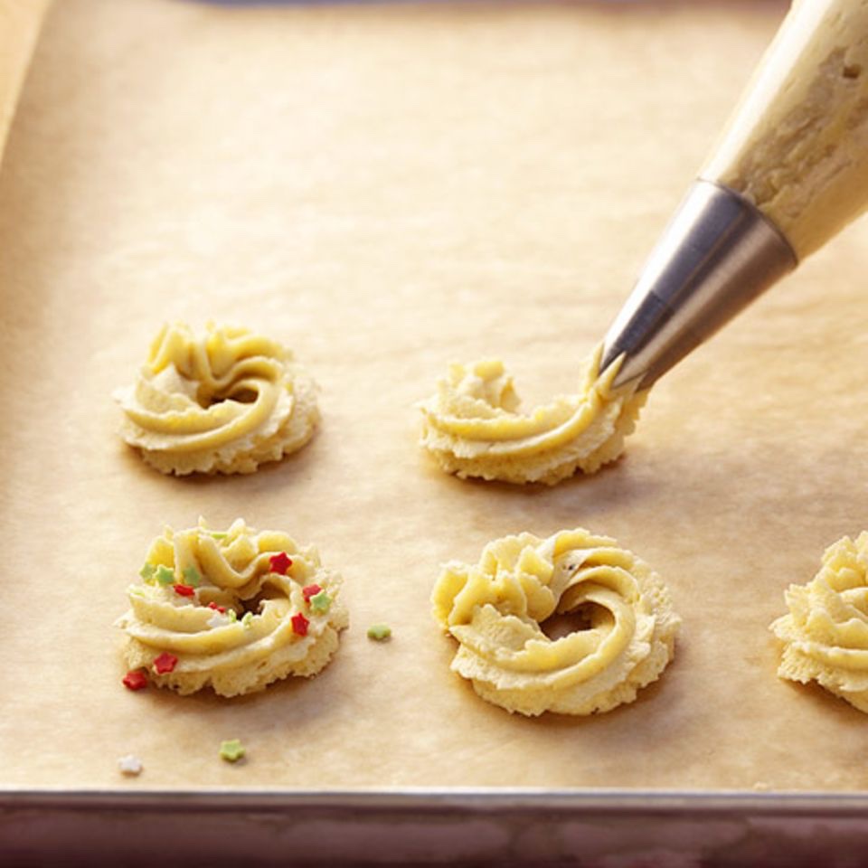 Die Masse in einen Spritzbeutel mit mittelgroßer Sterntülle füllen und als Kringel (à 4 cm Durchmesser) auf mit Backpapier ausgelegts Backblech spritzen.