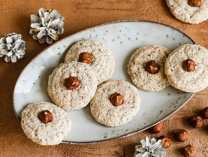 Zitronenschale mit Haselnüssen vermischen. Masse vorsichtig unter den Eischnee heben. Blech mit Backpapier belegen. Ofen auf 180°C Unter- und Oberhitze (160°C Umluft) vorheizen.