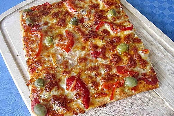 Basilikum waschen, trocken schütteln und die Blätter in feine Streifen schneiden. Paprika-Pizza mit Basilikum garnieren und mit frisch gemahlenem Pfeffer bestreuen.