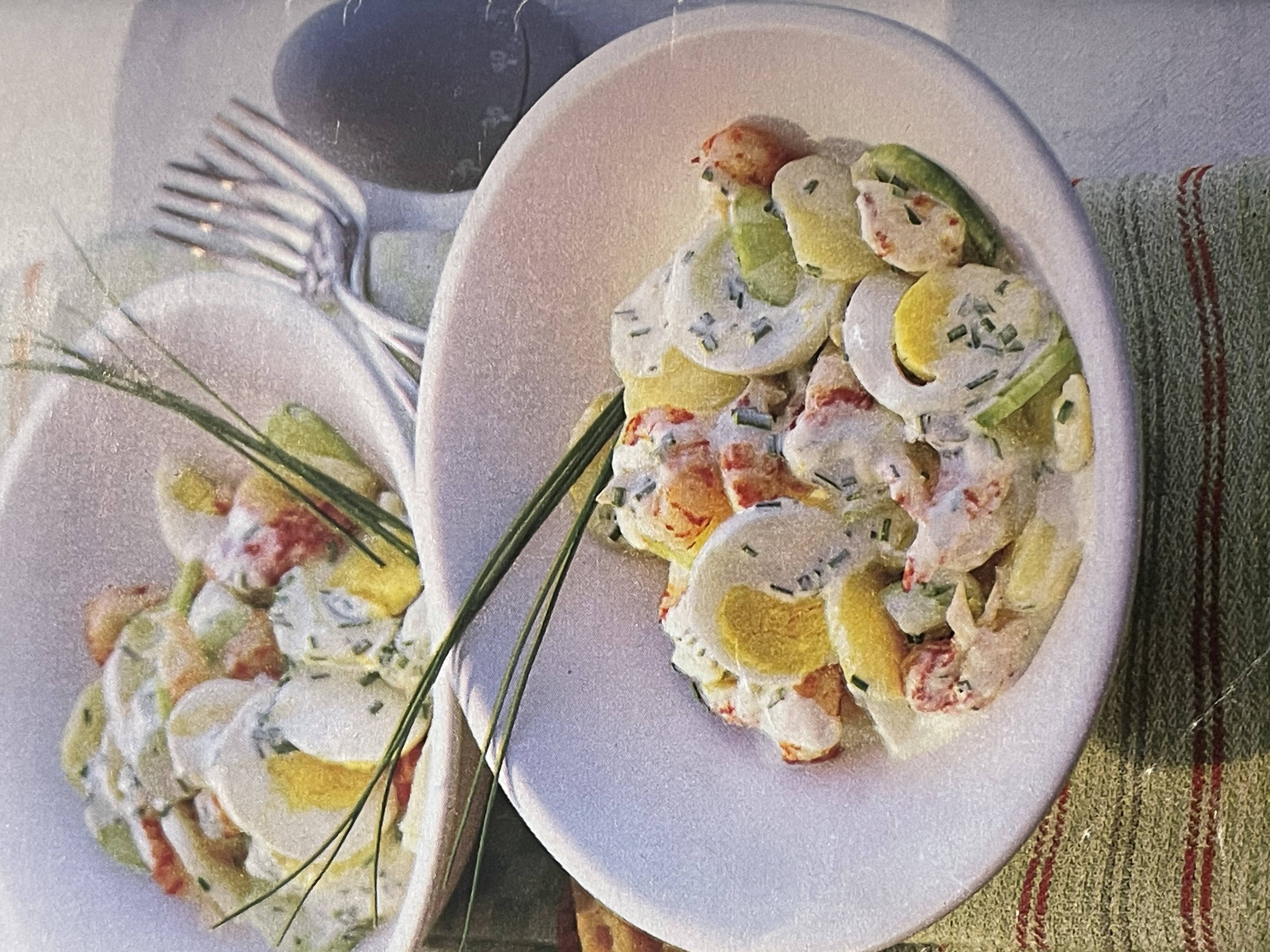 Schnittlauch in Röllchen schneiden und unter den Mayonnaise-Joghurt-Mix rühren. Diesen mit Salz, Pfeffer und Zitronensaft abschmecken. Krebsfleisch abtropfen lassen, mit Kartoffeln, Salatgurke und Kräutermayonnaise mischen, Eier unterheben. Alles mit Salz und Pfeffer kräftig abschmecken.
