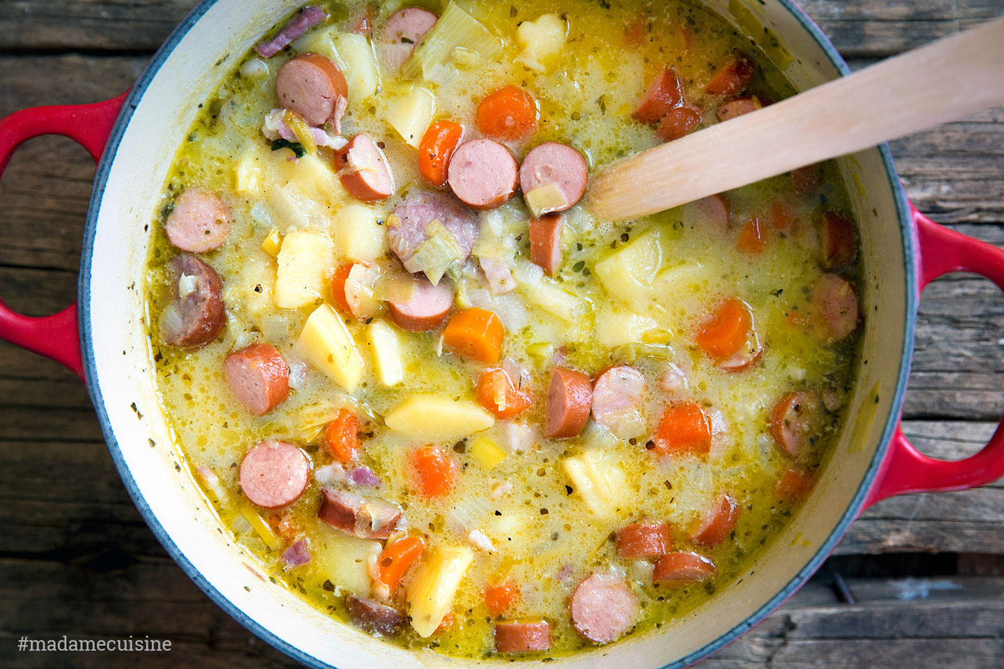 - Den Speck in einer kleinen Pfanne ausbraten. Würstchen in Scheiben schneiden. Zusammen mit der Sahne in die Kartoffelsuppe geben.